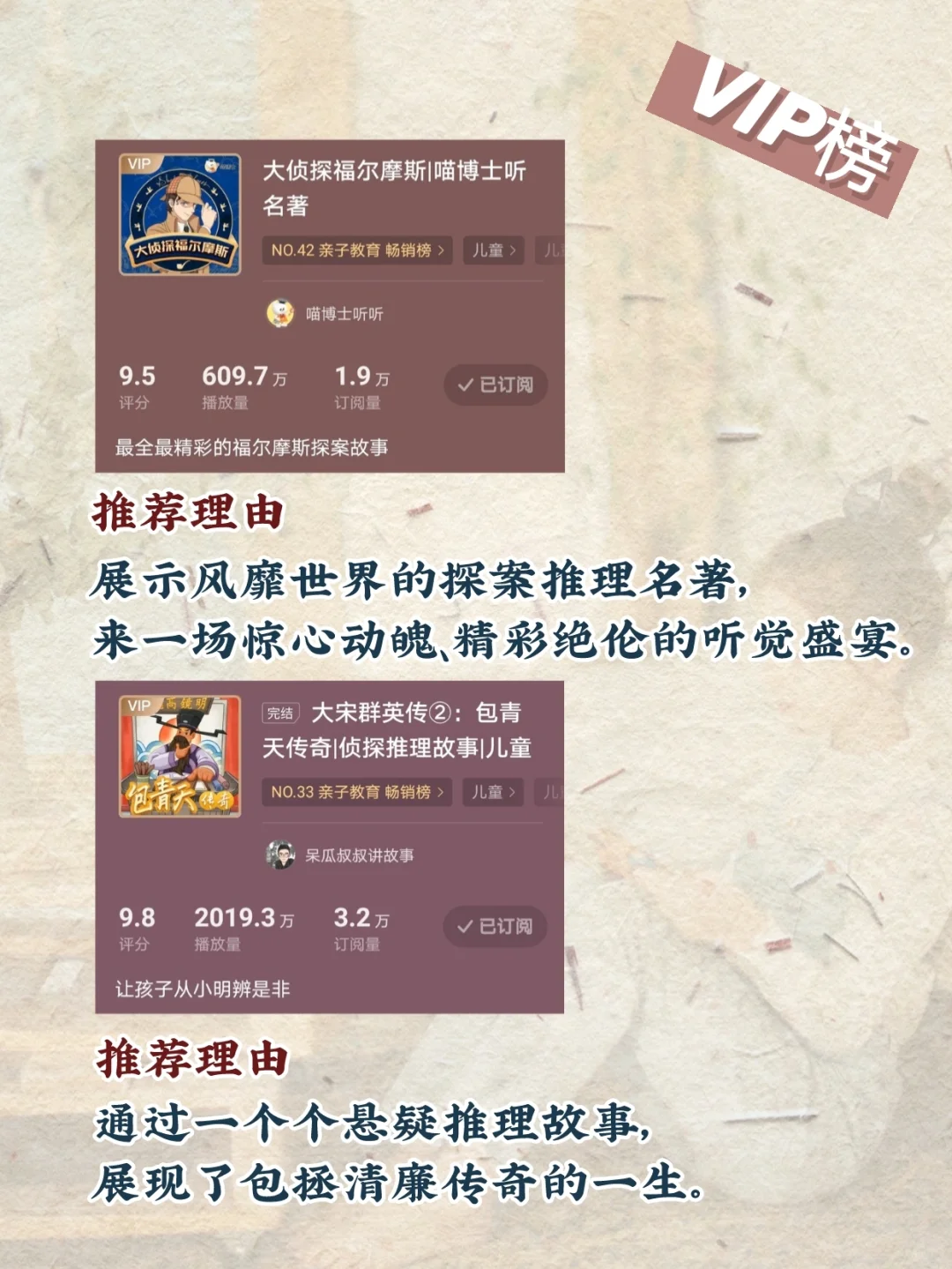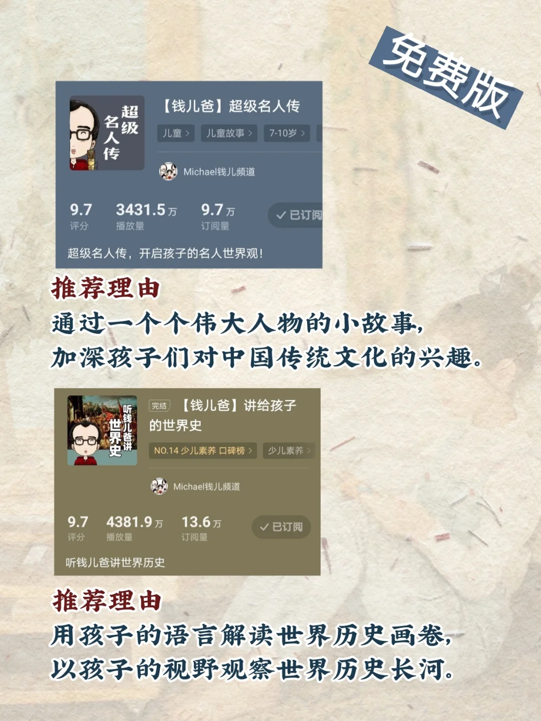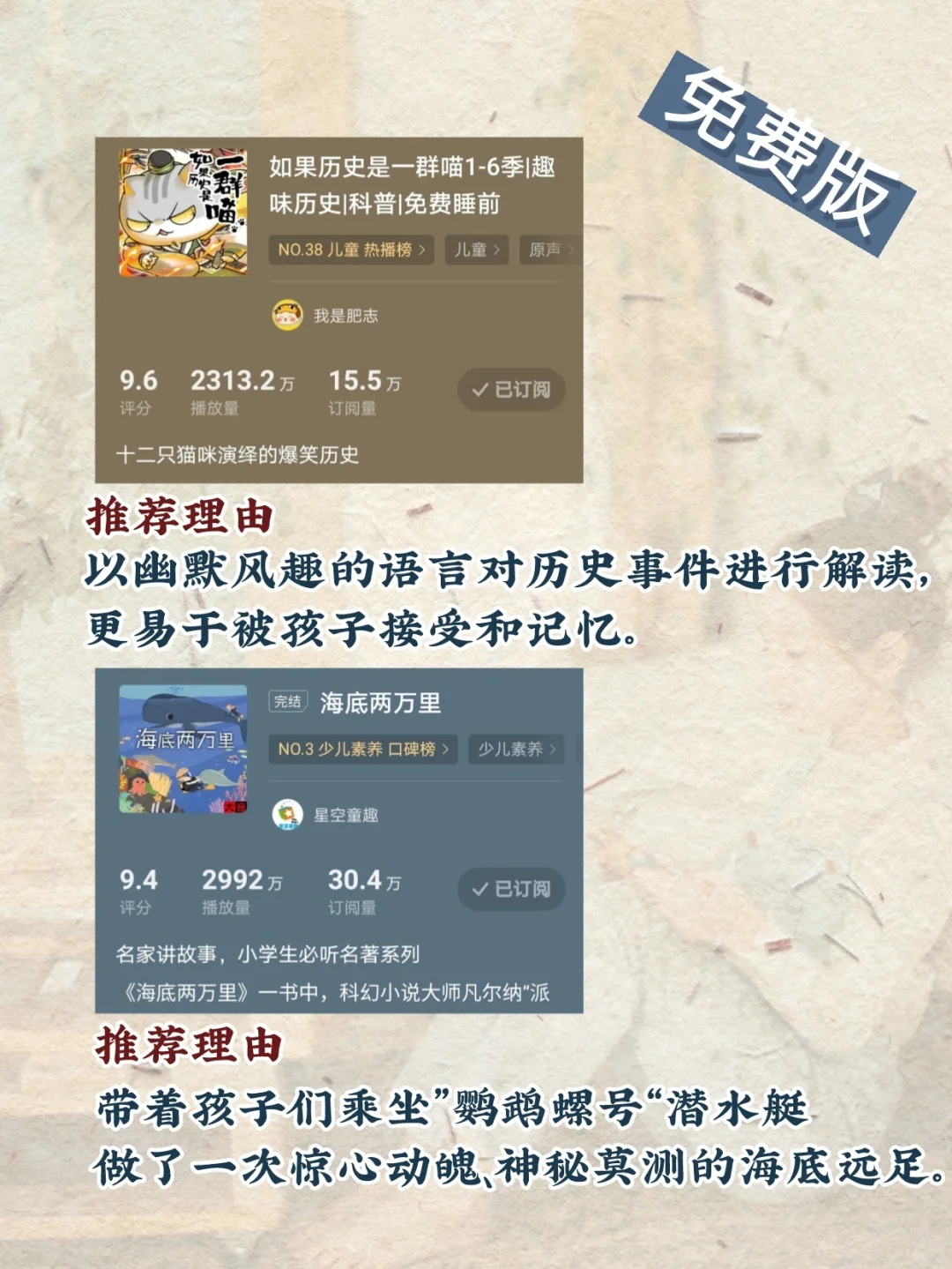 ♥️免费榜 1. 阳光少年报 推荐理由:每周选取适合孩子阅读的新闻,用讲故事的方式将新闻讲给孩子听,涵盖榜样人物、中国新闻、世界新闻、文化新闻、科技新闻等众多领域。 2. 婷婷唱古文 推荐理由:"背诗神奇",每一首古诗的谱曲都源自古诗本身的意境,朗朗上口,让孩子了解诗歌的真意。  3. 如果历史是一群喵 推荐理由:以华夏历史为主线,用幽默风趣的语言对历史事件进行重新解读,更易于被孩子接受和记忆。 4. 海底两万里 推荐理由:经典探险类世界名著,带着孩子们乘坐”鹦鹉螺号“潜水艇做了一次惊心动魄、神秘莫测的海底远足。  5. 【钱儿爸】超级名人传 推荐理由:通过一个个伟大人物的小故事,在孩子心里种下一颗颗善良、坚强、勇敢的种子,加深对中国传统文化的兴趣。 6. 【钱儿爸】讲给孩子的世界历史 推荐理由:从刀耕火种的蒙昧时代,到文明飞速发展的当今,用孩子的语言解读世界历史画卷,以孩子的视野观察世界历史长河。  ♥️VIP榜 1. 大侦探福尔摩斯|喵博士听名著 推荐理由:全景立体声儿童推理广播剧,展示风靡世界的探案推理名著,是一场惊心动魄、精彩绝伦的听觉盛宴。 2. 包青天传奇 推荐理由:提炼了《三侠五义》、《龙图公案》等文学作品,通过一个个悬疑推理故事,展现了包拯清廉、传奇的一生。  4. 山海经|三星堆|狮子老爸珍奇怪兽故事 推荐理由:陪伴孩子走进上古社会大百科,了解2000多年历史的远古神话、人文地理、珍奇异兽… 5. 八十天环游地球+神秘岛 推荐理由:让孩子着迷的经典探险类名著故事,用动人的语言介绍了世界各地的奇风异俗和丰富的地理知识。  6. 神奇校车经典故事 推荐理由:通过校园故事展示30个全新的科学场景,近百个有趣的科普笔记,让孩子疯狂地爱上科学。 7. 钱儿爸|《超级神话传说》 推荐理由:这是高度幻想的故事,也是民族文化传承之中必不可少的一部分。
