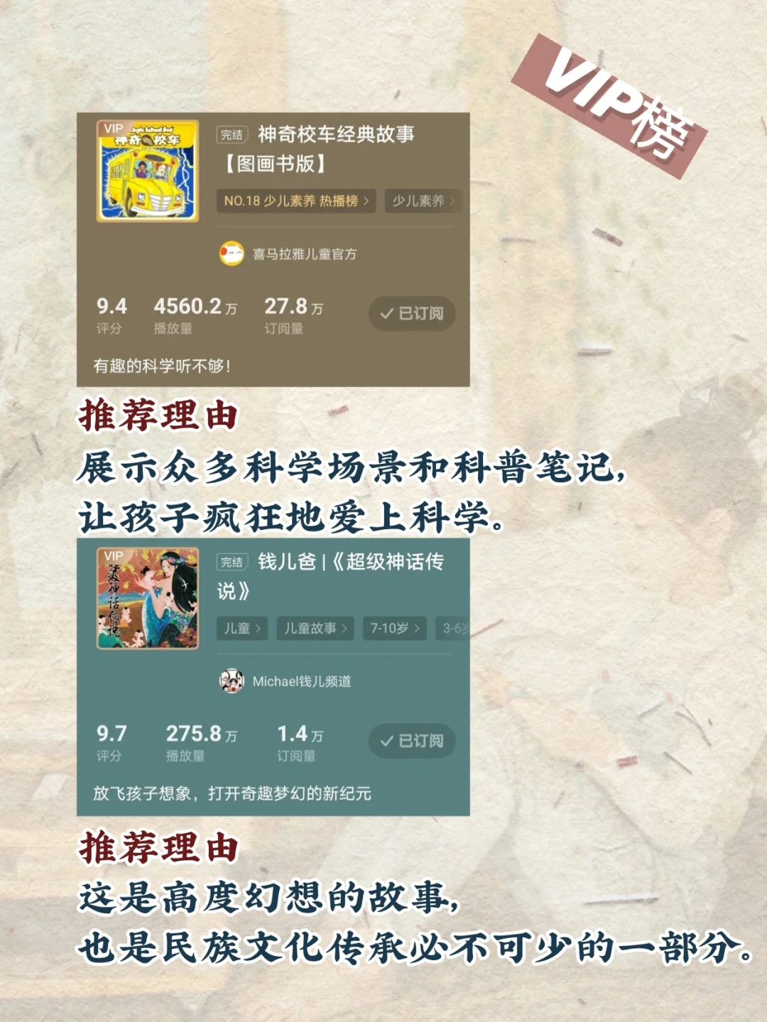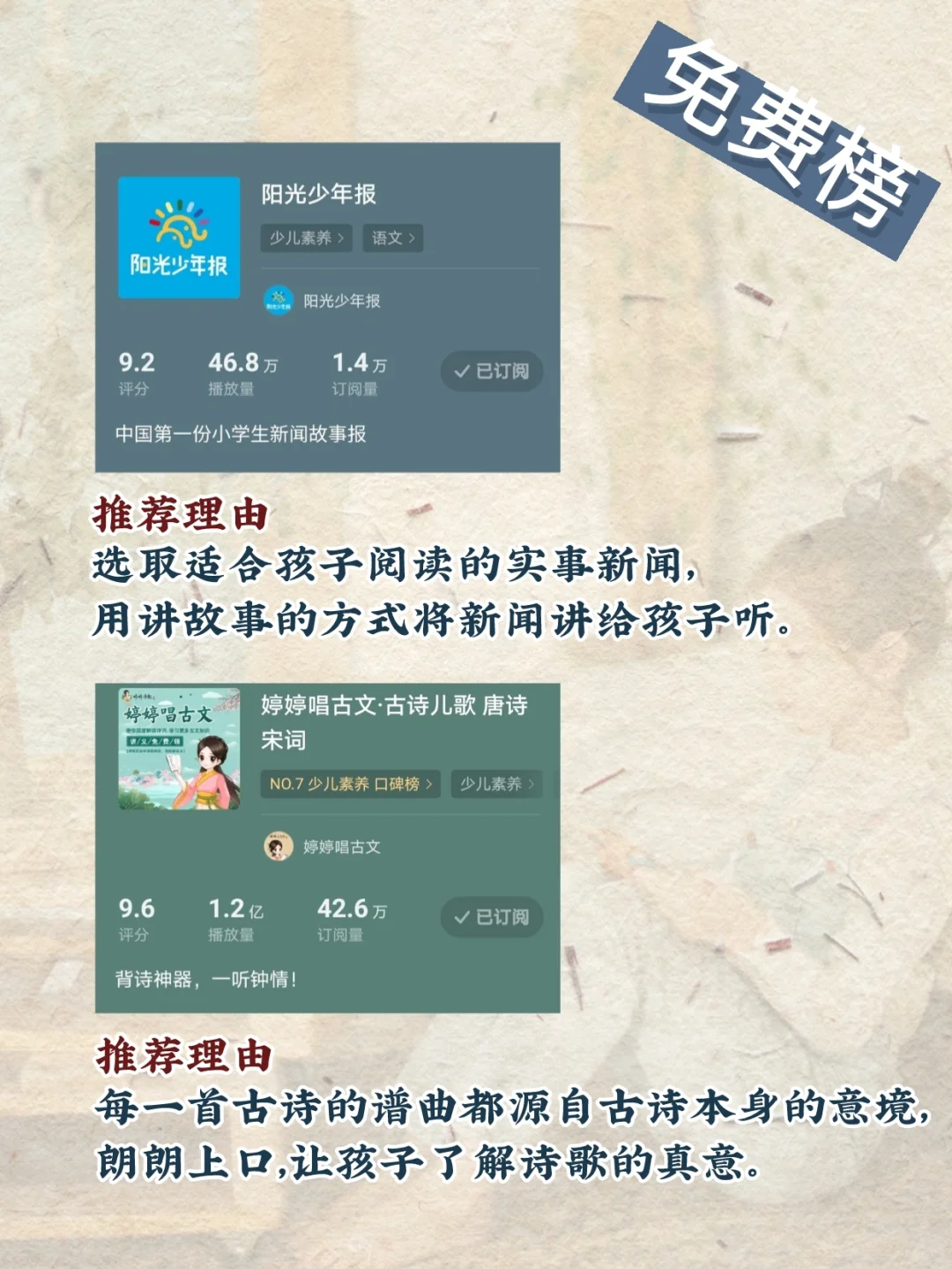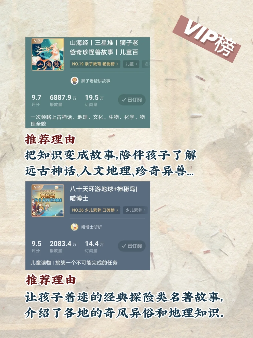 ♥️免费榜 1. 阳光少年报 推荐理由:每周选取适合孩子阅读的新闻,用讲故事的方式将新闻讲给孩子听,涵盖榜样人物、中国新闻、世界新闻、文化新闻、科技新闻等众多领域。 2. 婷婷唱古文 推荐理由:"背诗神奇",每一首古诗的谱曲都源自古诗本身的意境,朗朗上口,让孩子了解诗歌的真意。  3. 如果历史是一群喵 推荐理由:以华夏历史为主线,用幽默风趣的语言对历史事件进行重新解读,更易于被孩子接受和记忆。 4. 海底两万里 推荐理由:经典探险类世界名著,带着孩子们乘坐”鹦鹉螺号“潜水艇做了一次惊心动魄、神秘莫测的海底远足。  5. 【钱儿爸】超级名人传 推荐理由:通过一个个伟大人物的小故事,在孩子心里种下一颗颗善良、坚强、勇敢的种子,加深对中国传统文化的兴趣。 6. 【钱儿爸】讲给孩子的世界历史 推荐理由:从刀耕火种的蒙昧时代,到文明飞速发展的当今,用孩子的语言解读世界历史画卷,以孩子的视野观察世界历史长河。  ♥️VIP榜 1. 大侦探福尔摩斯|喵博士听名著 推荐理由:全景立体声儿童推理广播剧,展示风靡世界的探案推理名著,是一场惊心动魄、精彩绝伦的听觉盛宴。 2. 包青天传奇 推荐理由:提炼了《三侠五义》、《龙图公案》等文学作品,通过一个个悬疑推理故事,展现了包拯清廉、传奇的一生。  4. 山海经|三星堆|狮子老爸珍奇怪兽故事 推荐理由:陪伴孩子走进上古社会大百科,了解2000多年历史的远古神话、人文地理、珍奇异兽… 5. 八十天环游地球+神秘岛 推荐理由:让孩子着迷的经典探险类名著故事,用动人的语言介绍了世界各地的奇风异俗和丰富的地理知识。  6. 神奇校车经典故事 推荐理由:通过校园故事展示30个全新的科学场景,近百个有趣的科普笔记,让孩子疯狂地爱上科学。 7. 钱儿爸|《超级神话传说》 推荐理由:这是高度幻想的故事,也是民族文化传承之中必不可少的一部分。